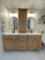 These homeowners were in desperate need of more storage and a larger shower for their master bath. The footprint of the room was good, and with a little tweaking and some creative angles we maximized the area in the custom tile shower without giving up the deep soaking tub. A cabinet atop the custom finished vanity and a shelf for linens over the tub space delivered the additional storage they needed. And don't you just love the warm wood tone next to the crisp white marble floor and calm, watery blue shower?